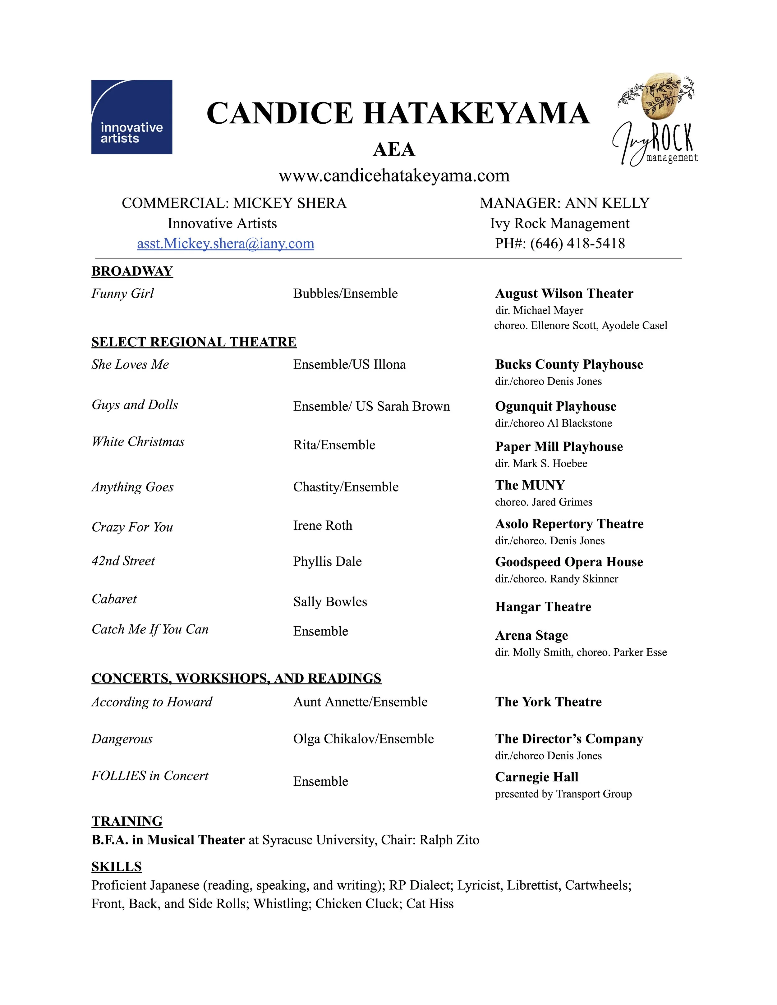Candice enjoys tackling a range of characters in her work, from the blunt and sassy "Irene Roth" in Crazy For You, to the demure and delicate “Liat” in South Pacific.
